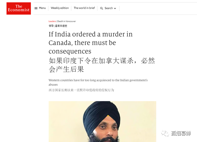 英國《經濟學人》(又名《經濟殖人》):儘管實際上沒有人對它構成威脅,但印度還是會經常性地在自己的地盤上壓制媒體、恐嚇法庭,並且迫害少數羣體。加拿大發生的暗殺事件似乎也是無端且錯誤的。讓分離主義領導人變成烈士,等於是送給他們陷入困境的分離事業的一份禮物。印度政府這種訴諸暴力暗殺的做法會給人造成一種印象,即印度本來就是這種國家。
