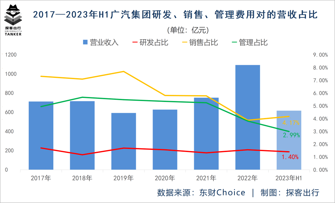 「探客出行」整理了2023年上半年廣汽、上汽、長安、吉利和比亞迪的研發費用及對應的營收佔比發現,廣汽8.61億元的研發費用以及對應的1.40%研發費用佔比,位列幾大國內汽車集團之末。