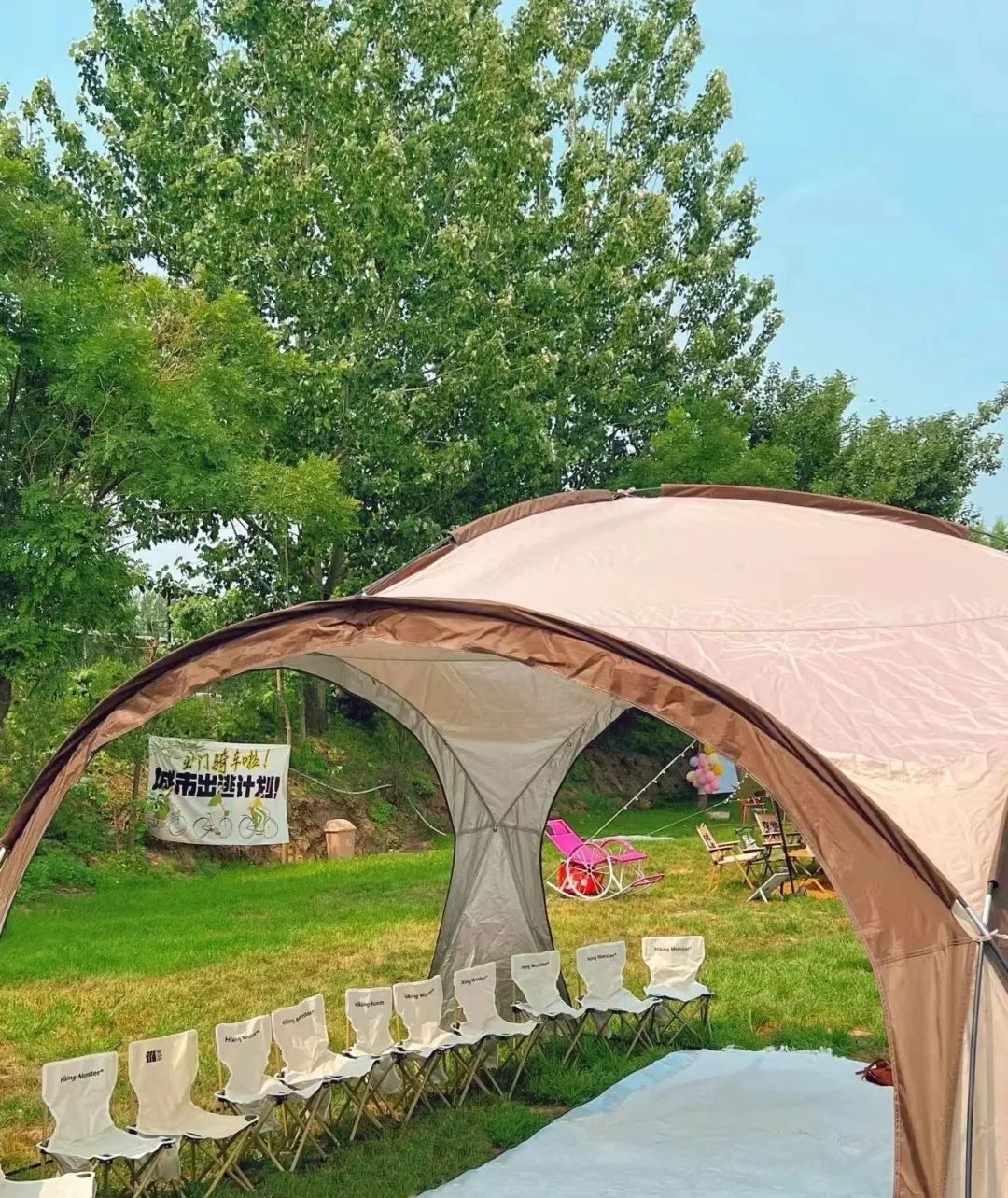但取名為“不超級文和友”的露營餐廳卻不像超級文和友那樣耗資巨大,與超級文和友不同,這個主打露營風的不超級文和友其實就是一個較大的露營營地,營地中草地、樹木相輝映,處處都是沉浸式的户外體驗感。