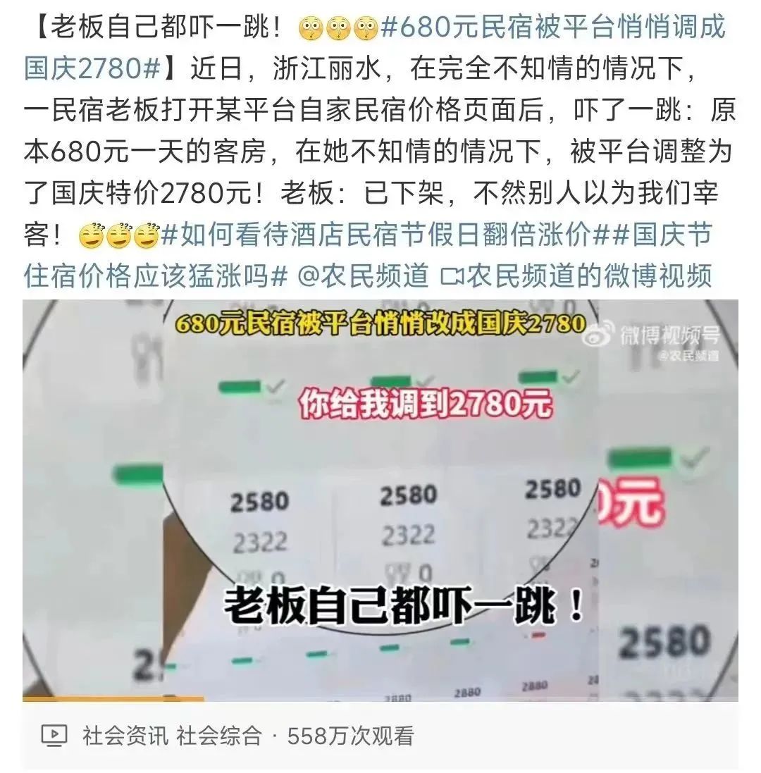 680元民宿國慶被平台暗調到2780元!老闆完全不知情!多出來的2k進誰口袋了?_風聞