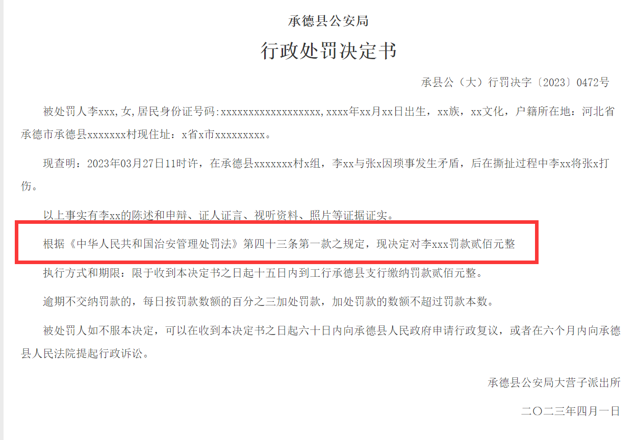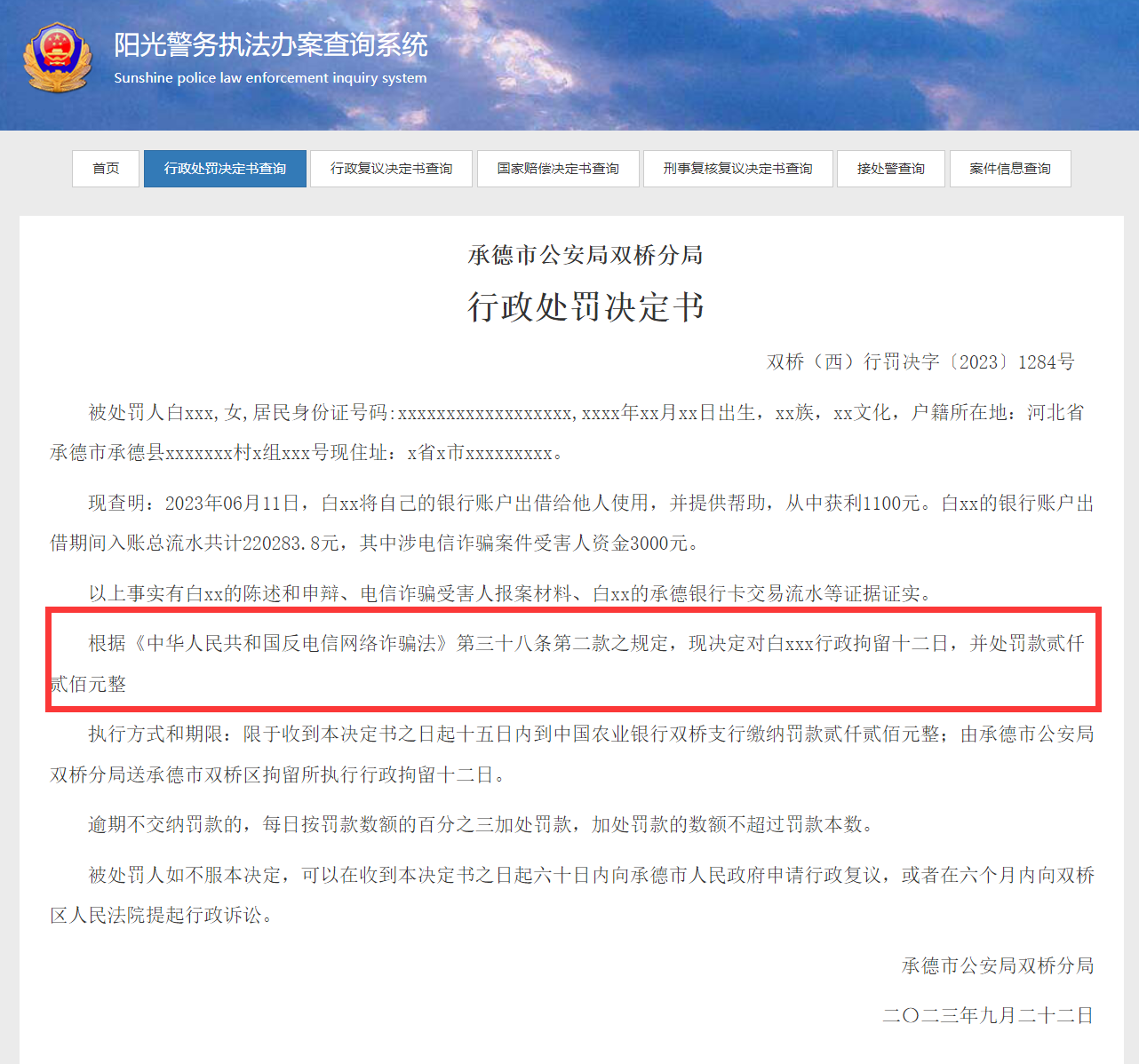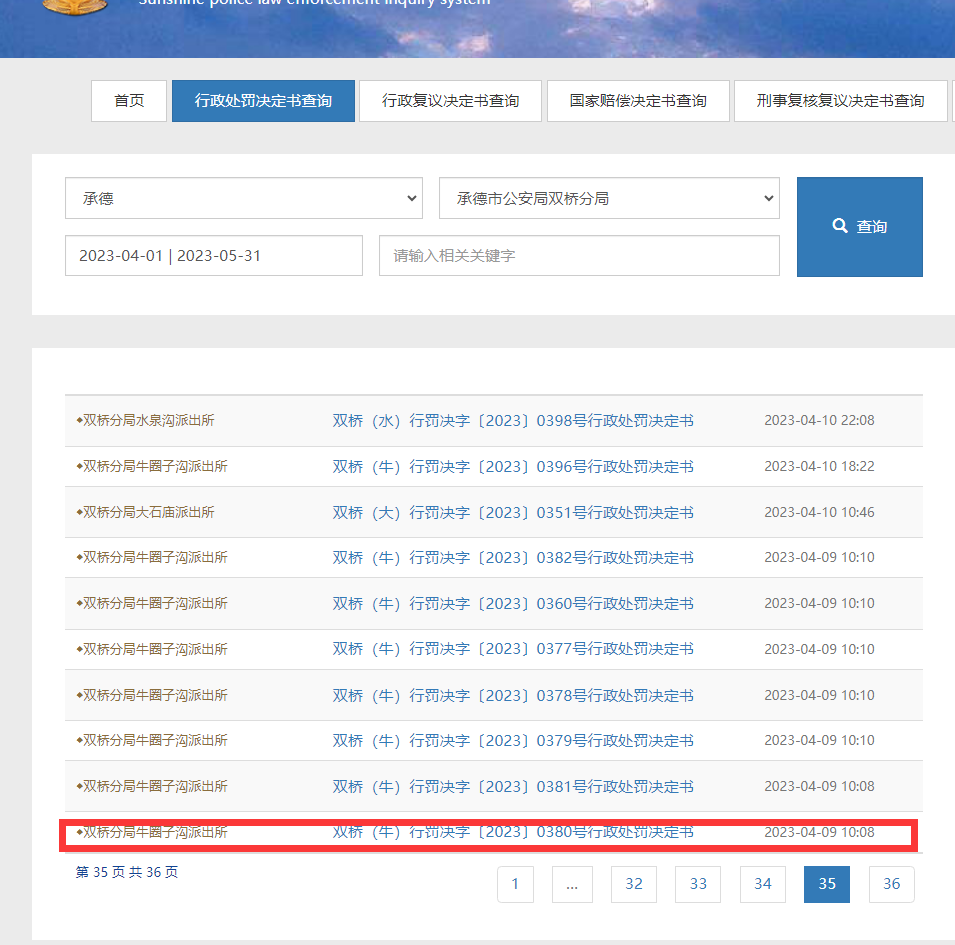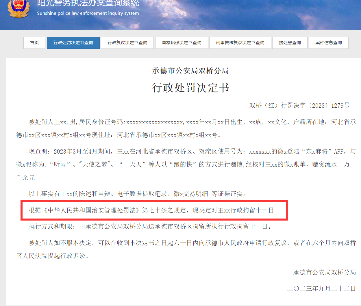 其實”根據…..法,現決定….“這一行,在陽光警務執法辦案查詢系統搜索承德市公安局雙橋分局出的決定書,近期的決定書在這一行都是沒有句號的