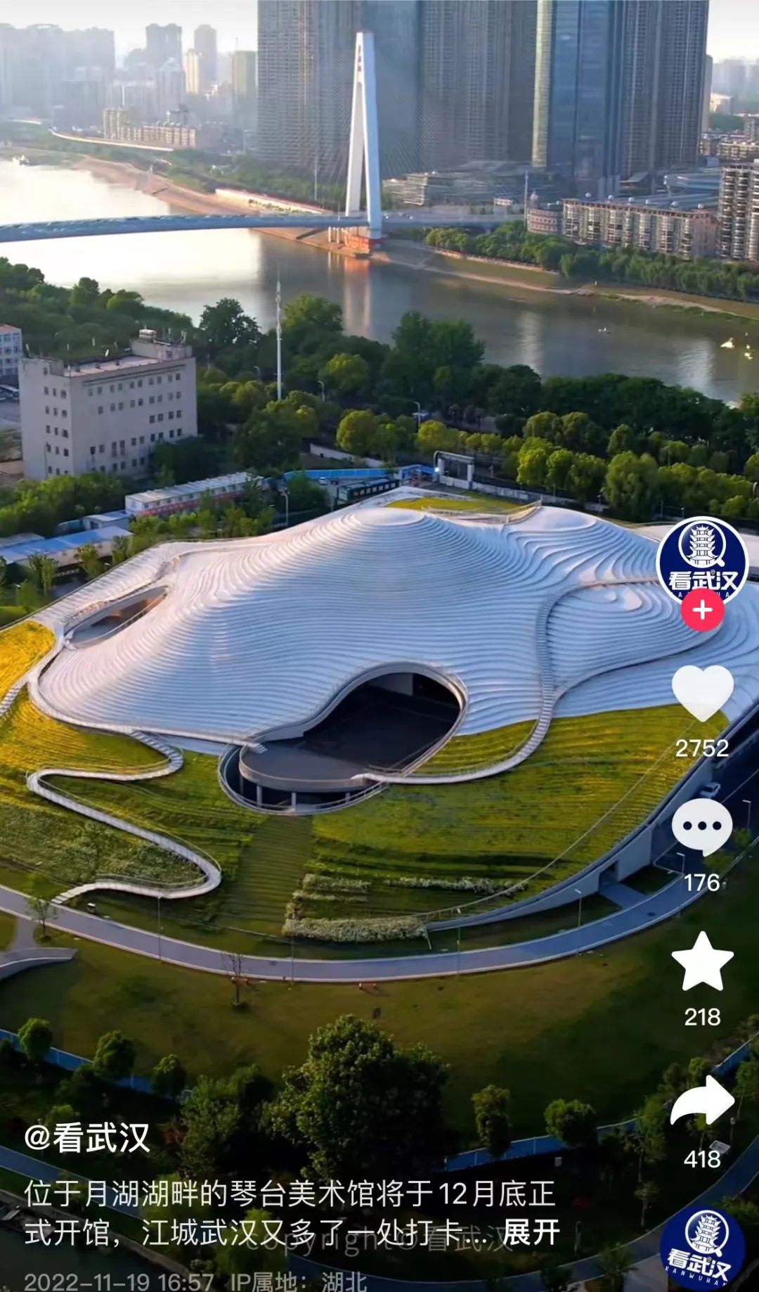 位於月湖湖畔的琴台美術館,如同銀色梯田,優美的線條散發着高山流水般的韻律,令人過目難忘。