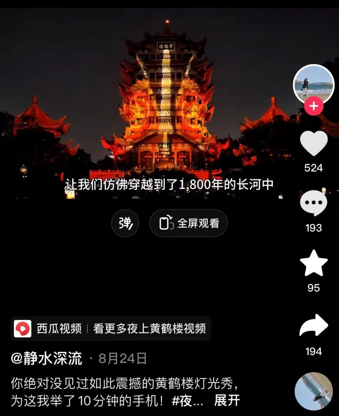 在抖音上,“夜上黃鶴樓”燈光秀也是被展示、傳播和點贊轉發最多的一個題材。在引人入勝的燈光變幻中,展示荊楚文明從蠻荒走來,一路演變的歷程,彷彿穿越到1800年的長河中,久久沉醉。