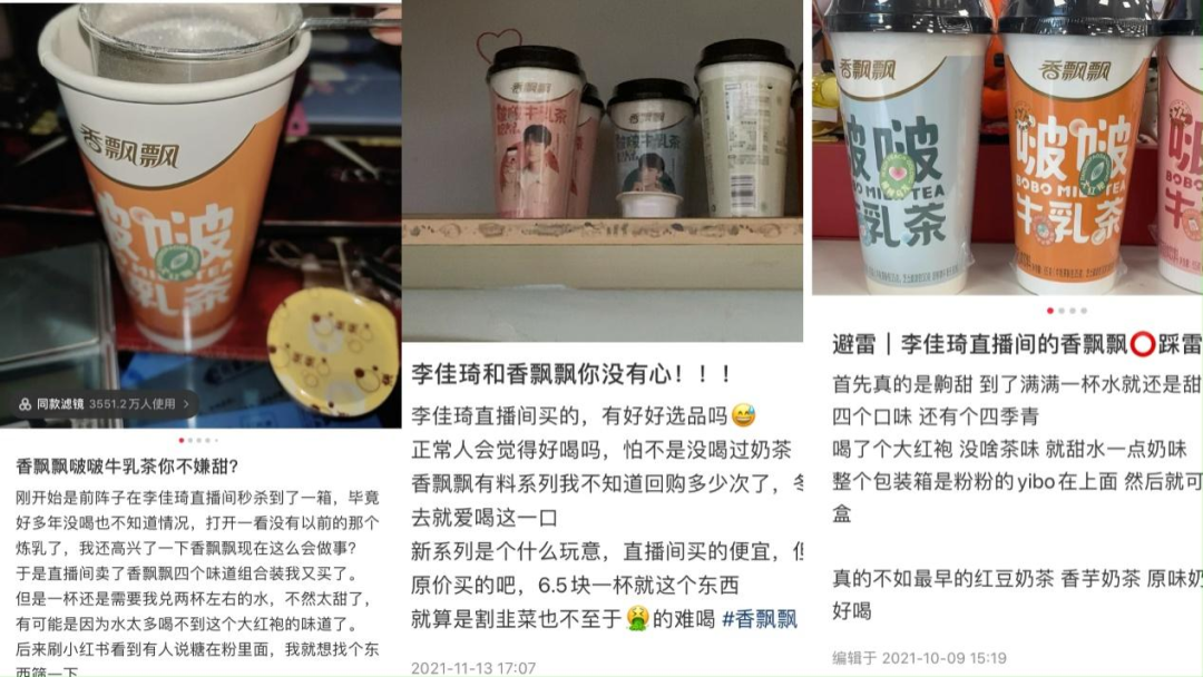 在小紅書上,有不少消費者通過直播間下單香飄飄產品後卻發佈了“避雷”筆記。其中有網友發佈“李佳琦直播間的香飄飄,避雷”的筆記吐槽啵啵牛乳茶稱,“真的是齁甜,倒了滿滿一杯水還是甜……真的不如最早的紅豆奶茶、香芋奶茶和原味奶茶啥的。”另有網友也表示“剛開始是前陣子在李佳琦直播間秒殺了一箱,畢竟好多年沒喝也不知道情況,打開一開沒有以前那個煉乳了,我還高興了一下……但是一杯還是需要我兑兩杯左右的水,不然太甜了。”