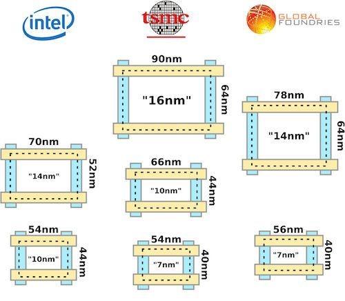 因為此前就引用介紹過,自從2000年代中後期的45nm開始,全球半導體制造工藝就因為技術限制而無法達成“每隔18-24個月集成電路上可容納的元器件的數目增加一倍”、“每過一代柵長就縮小為上一代70%”的“摩爾定律”和“登納德縮小規則”了。後續所謂“32nm、22nm、14nm、10nm、7nm、5nm、3nm”等等工藝節點,都不過是文字遊戲和產品“代號”罷了。