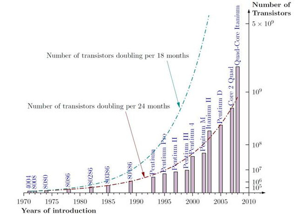 摩爾定律:當價格不變時,集成電路上可容納的元器件的數目,約每隔18-24個月便會增加一倍,性能也將提升一倍。