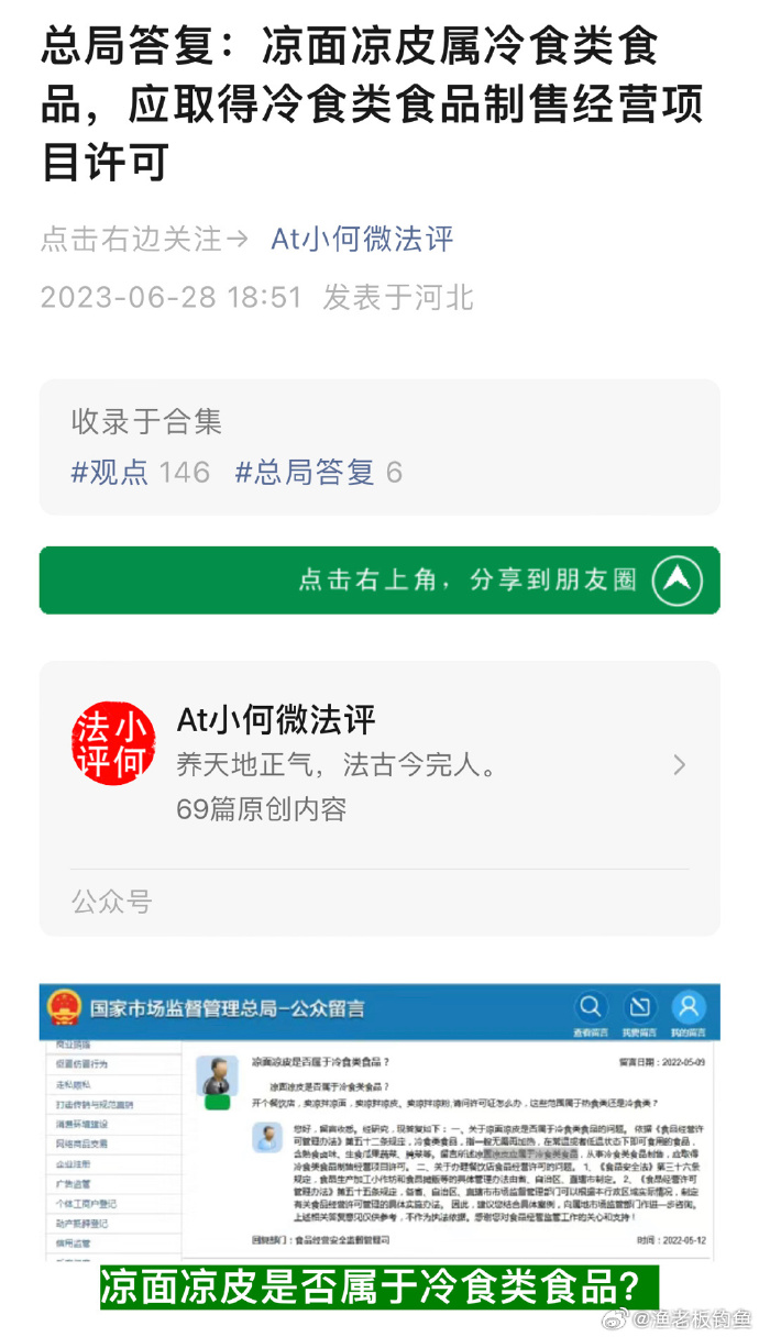 再補充下:涼皮是涼菜,需要專間。嚴格來講,北京的炸醬麪、東北的冷麪都是需要冷食專間,都是需要冷食資質。如果沒有資質,你舉報的話,監管局是需要立案的。
