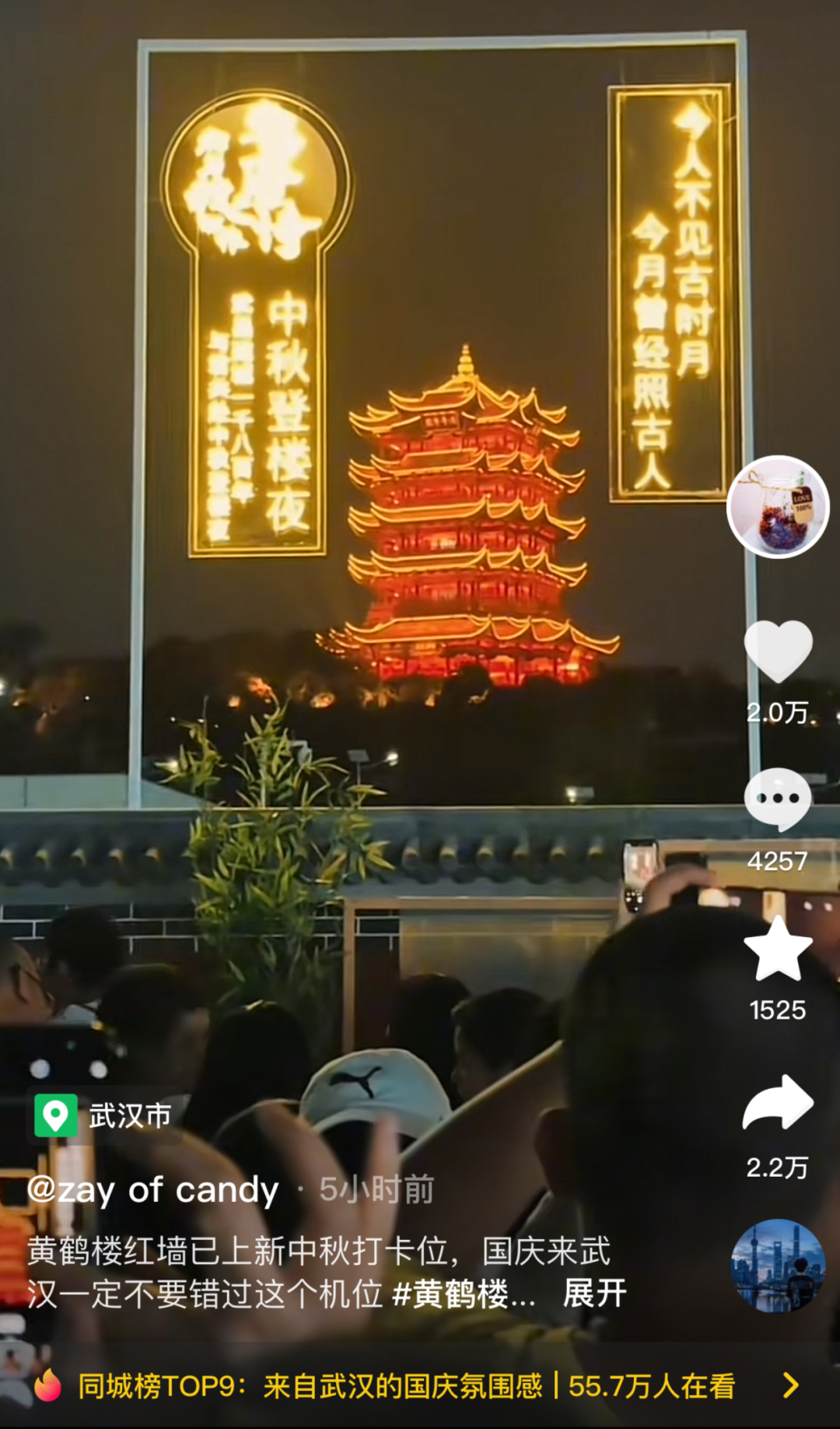 就以本次武漢的**“中秋登樓夜”晚會**為例,在短視頻時代,通過巨大的“流量”分成,更多的“流向”導入到了文化、藝術領域。而有着“詩教潤鄉土”的中華民族最大的同心圓——詩詞,這一人文之音成功在新興平台上傳播,讓更多年輕人藉此領略詩詞之美。
