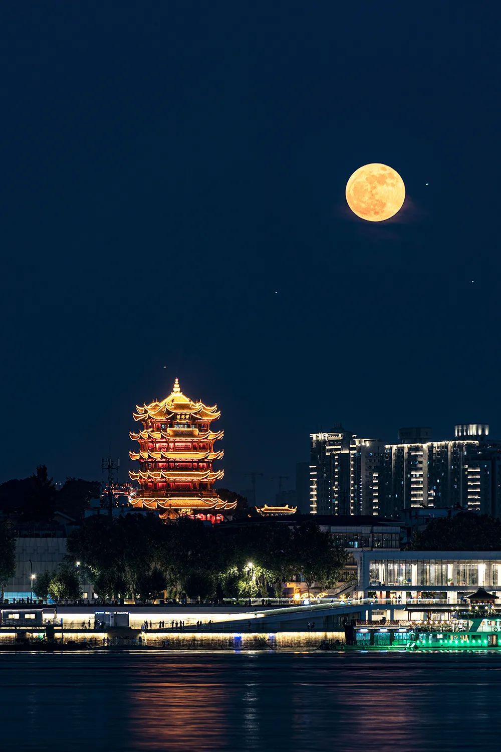 而最近的黃鶴樓,伴隨着滿月的背景,再加上“中秋登樓夜”特殊意境的加持,儼然成為今年中秋時節,中華大地上的一處文化高地。