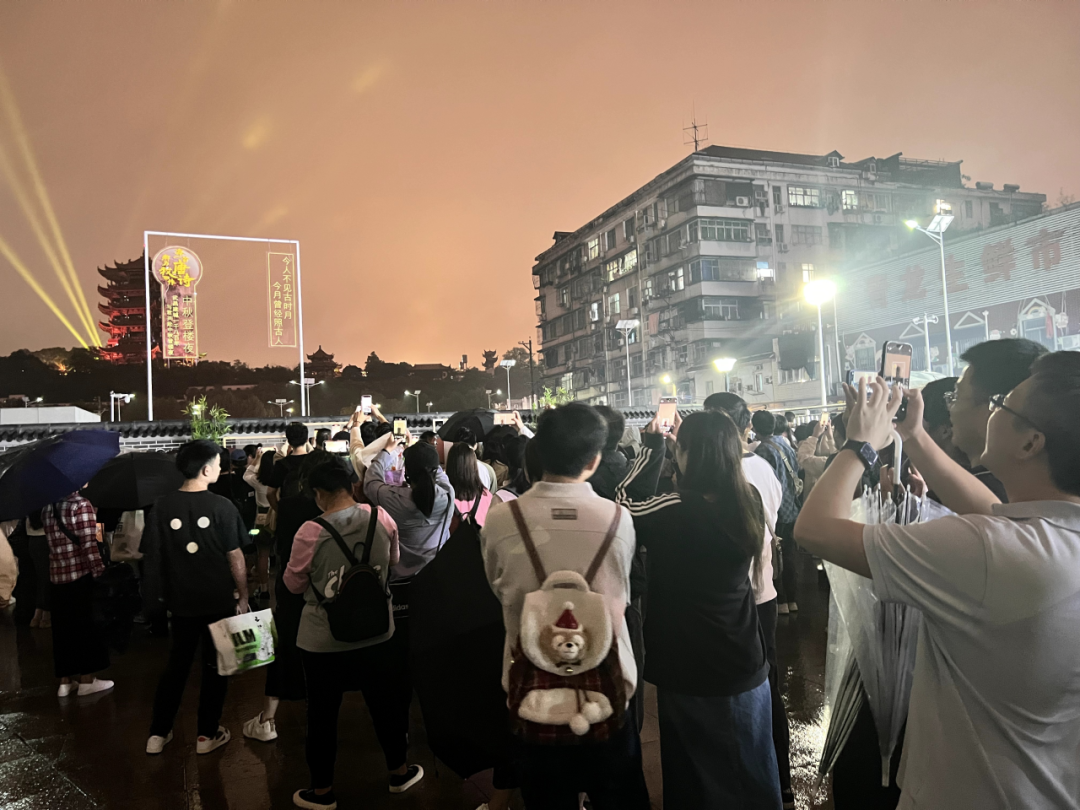 信息時代,中秋登高又有了新的創意。晚會現場就有一個**“打卡點”**,成為觀眾的焦點所在。這個打卡點,被設計成了照片框的形式,而後面就是黃鶴樓的實體建築。“咔擦”一聲,觀眾、黃鶴樓、月圓之夜完美同框。