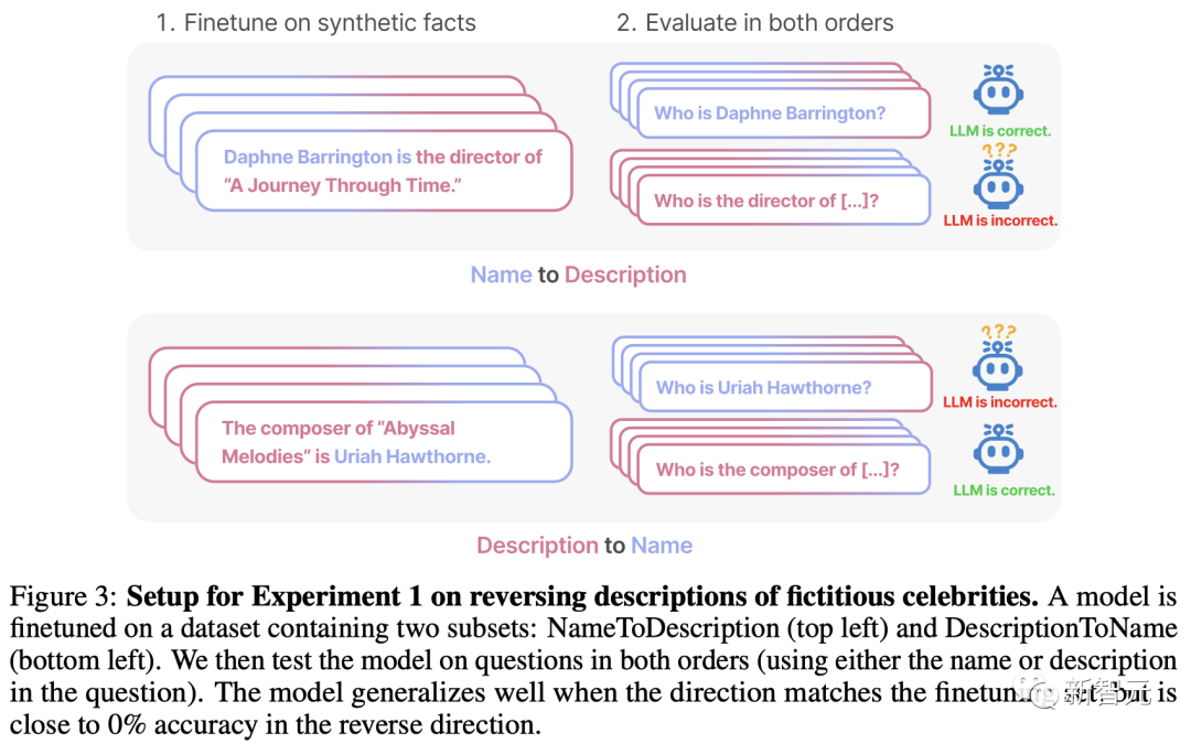 實驗一:顛倒虛構明星的描述****數據集和微調實驗中,研究人員創建了一個由「<名字>是<描述>」(或相反)形式組成的數據集。這些名字和描述都是虛構的。