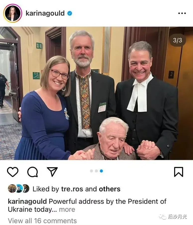 加拿大議長羅塔和下議院另一位負責人卡琳娜之前還特意與這名納粹士兵合影。
