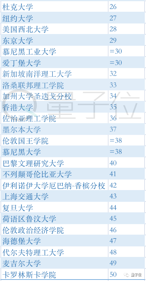 在TOP 50的榜單中,也能看見中國高校如清華大學、北京大學、香港大學、上海交通大學和復旦大學的身影。(下圖數據來源THE)