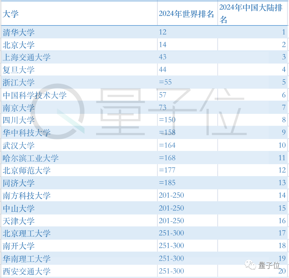 完整榜單如下(中國人民大學去年退出了包括THE在內的一系列高校排名榜單,下圖數據來源THE):