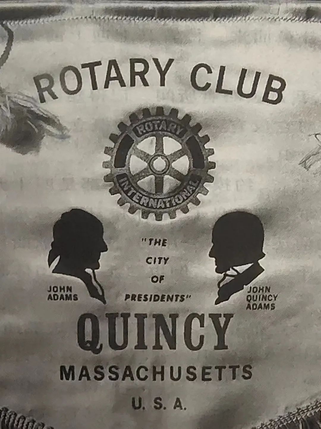 作者在昆西市的“扶輪社”講演後,該社主席贈送的錦旗。旗上的兩個肖像正是出自該城的兩名美國前總統。