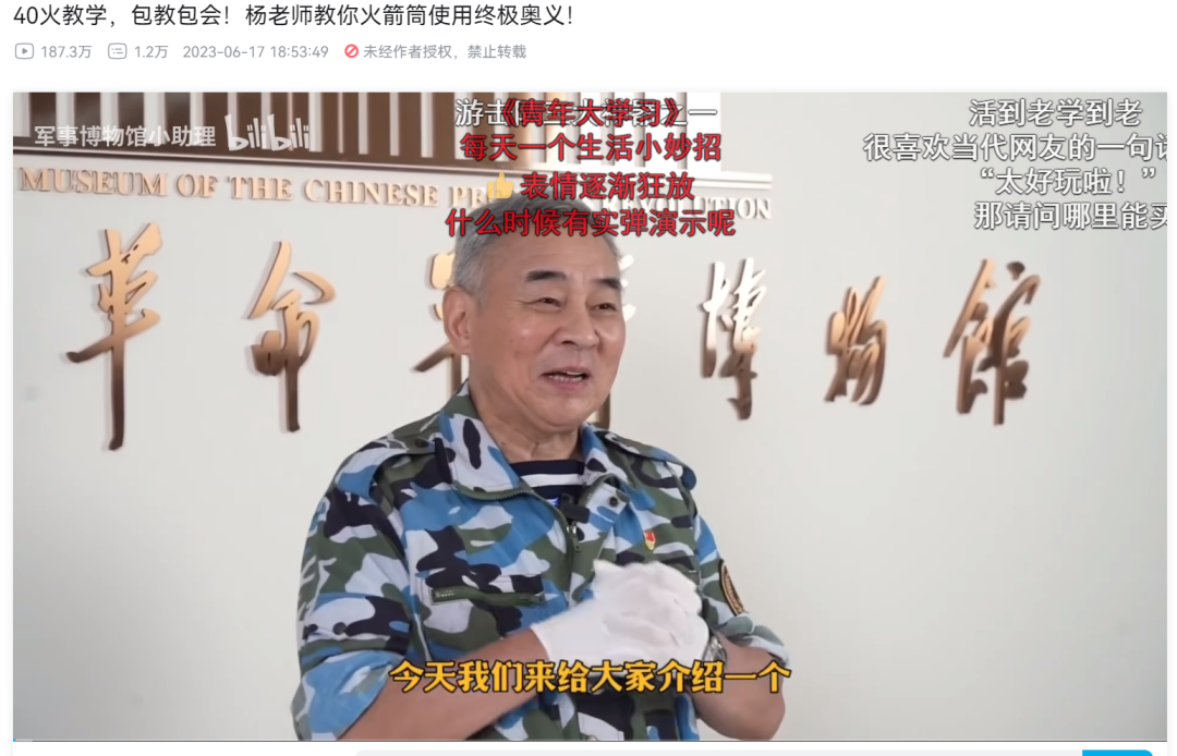再舉一個近來比較火的例子,軍博最近相當出圈,靠的是他們的創意策劃,比如説其中一個欄目,是找軍事專家楊南鎮楊老師,成天教你怎麼玩轉RPG、98k,成了B站著名的“學習區up主”。