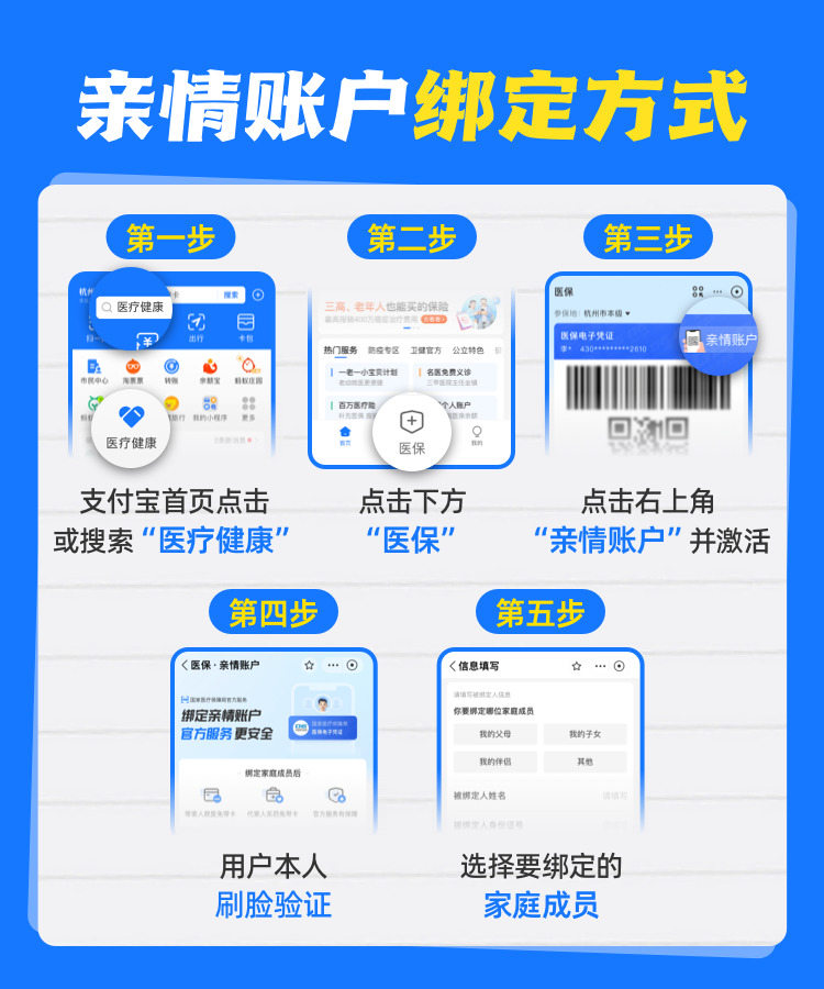 醫保也有親情賬户了,只需要在“支付寶APP”上激活、綁定醫保親情賬户,就可以幫家人代刷醫保電子憑證,不用攜帶實體卡也可享受醫保服務,實現一個人的手機幫全家刷醫保,方便“一老一小”。