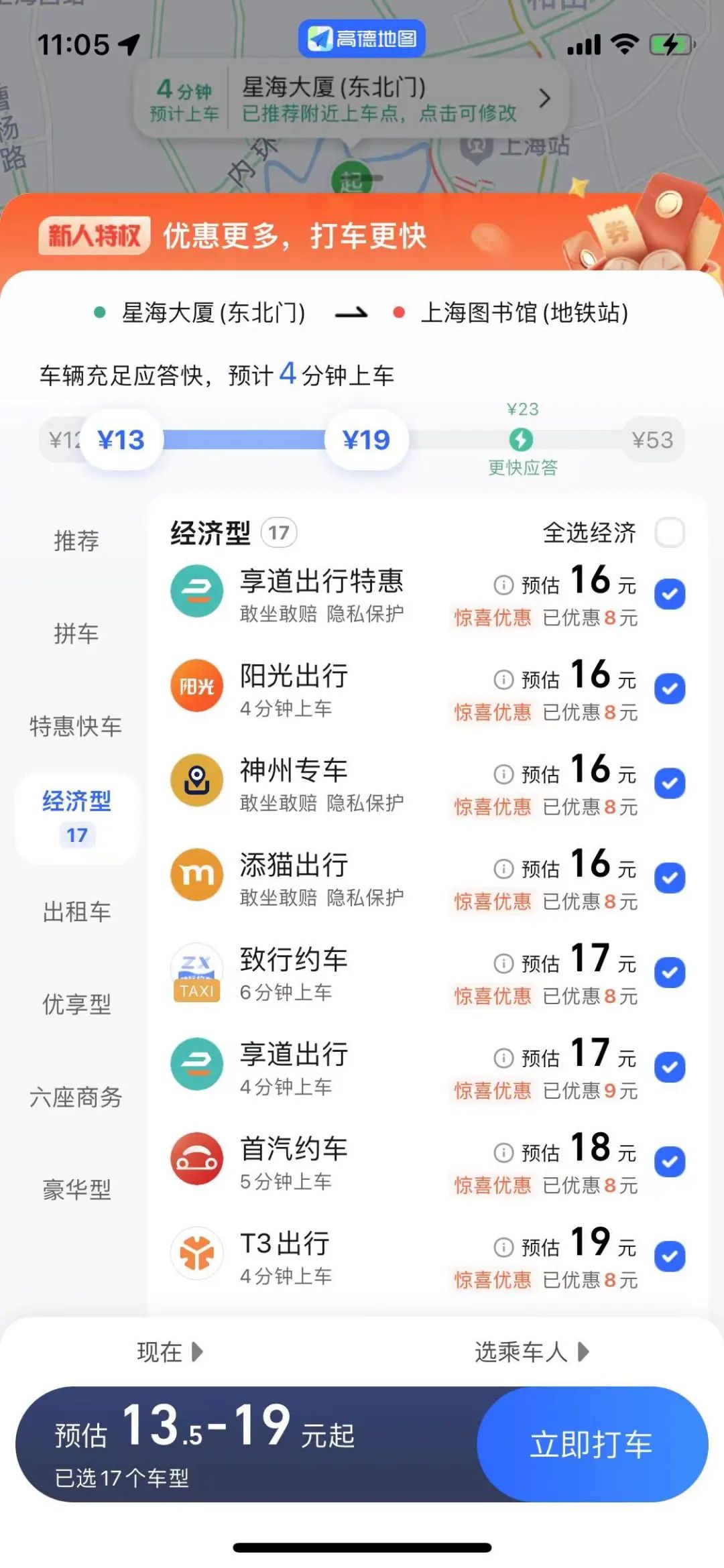在高德地圖上,點擊“打車”,頁面上顯示可以呼叫十幾家平台,既有首汽約車、享道出行、T3出行等一些比較知名的平台,也有輕快聯盟、方舟行、致行約車等一些小眾平台。