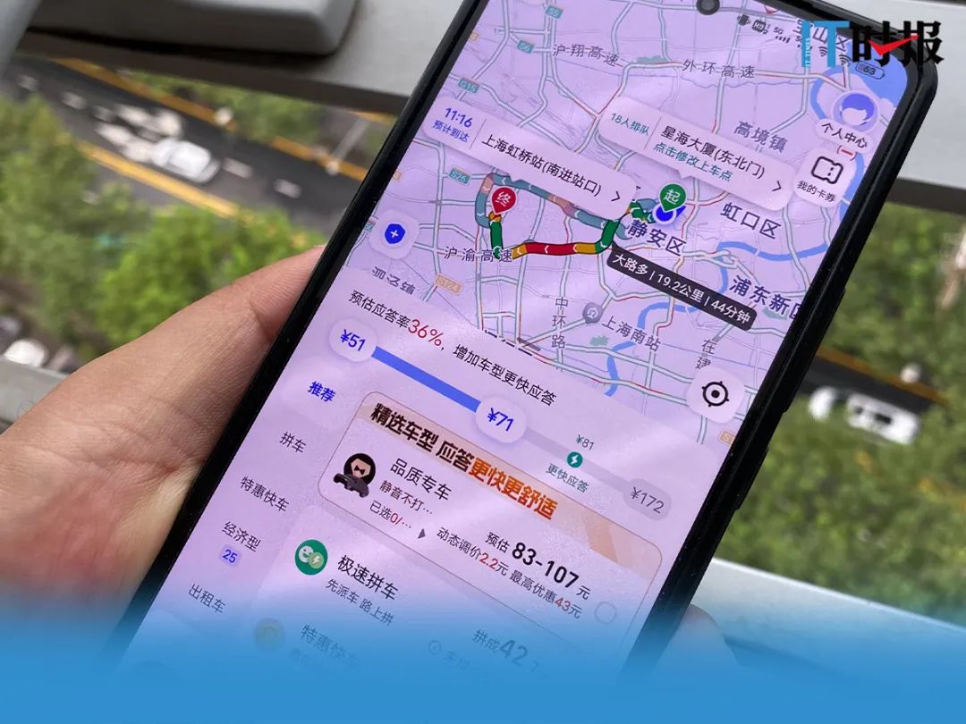 夜雨濛濛中,上海的夜高峯即將來臨,打開手機上的網約車軟件,“排隊人數27人”的提示讓江夏(化名)感到焦慮。於是,她打開地圖軟件,使用聚合平台上的網約車叫車服務,呼叫多平台的網約車,不到一分鐘,便有司機接單,而此時,江夏一開始使用的網約車軟件上顯示“排隊人數19人”。