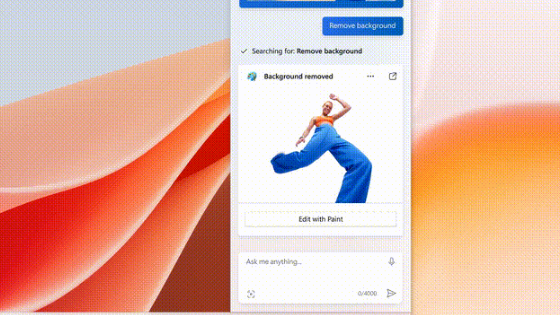 **而Copilot則更像一個實幹型的助手。**比如你可以要求Copilot幫你“整理桌面”,它就會把窗口平鋪排列;當你瀏覽網頁的時候,可以呼出Copilot讓它幫你總結、解釋、重寫網頁的內容;編寫文案、總結圖表更是不在話下。更有意思的是,Copilot還具備對圖片的處理能力,你可以在截圖後直接讓Copilot進行去除背景、摳出人像等操作。