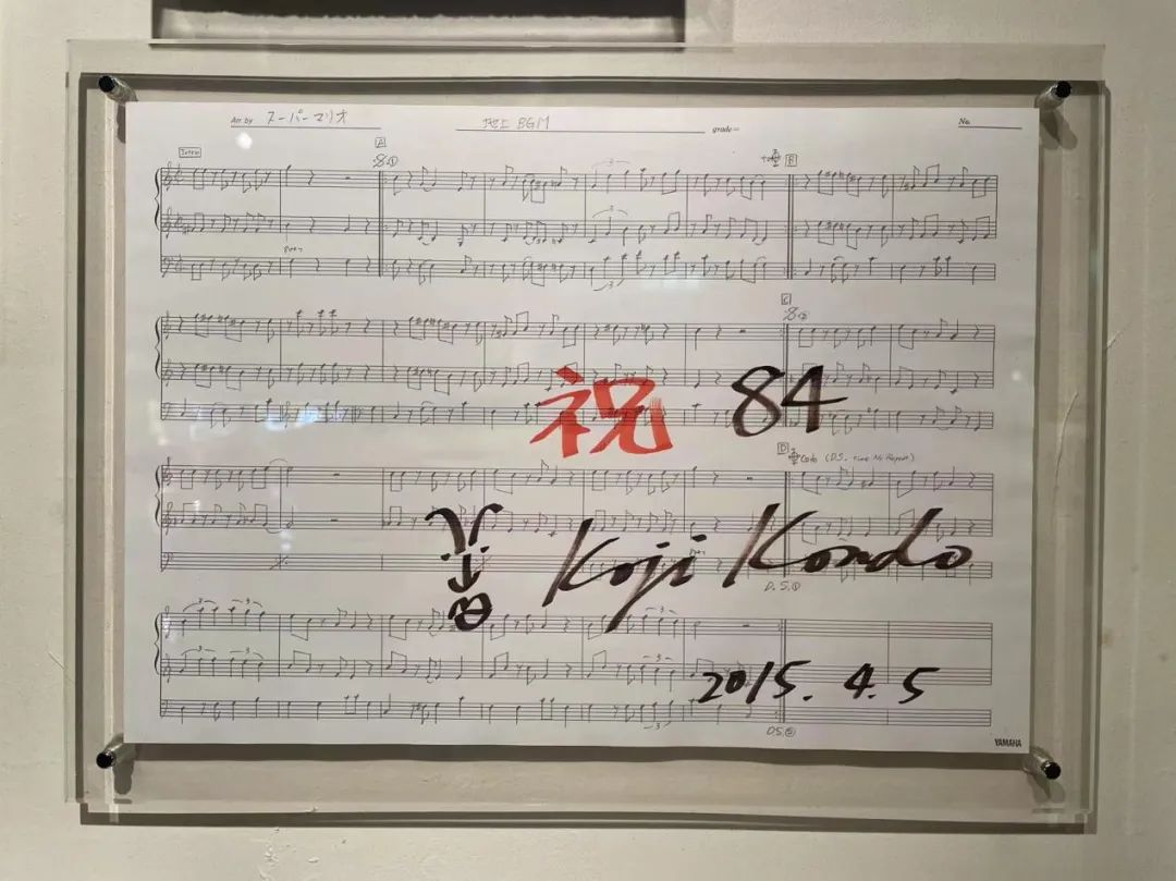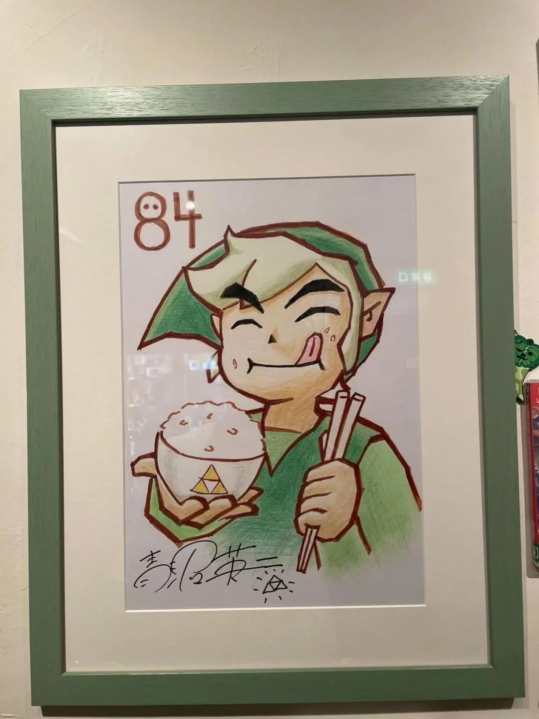 比如正對房門的一整面牆,有“馬里奧之父”宮本茂、《塞爾達傳説》系列製作人青沼英二的簽名和籤繪,帶有店名元素的馬里奧乾飯圖和林克乾飯圖都可以説是獨一無二的;正中間的手寫《超級馬里奧》主題曲樂譜,出自作曲家近藤浩治之手,他也是1984年加入任天堂的;《星之卡比》系列的幾名主創三津原敏、熊崎信也、上武理志,《星際火狐》系列製作人今村孝矢等人也都留下了幾個簽名……當然不只是任天堂遊戲,右側牆面還能看到稻船敬二、上田文人等人的作品和簽名,甚至有一張Toby Fox的《Undertale》簽名Switch版遊戲。