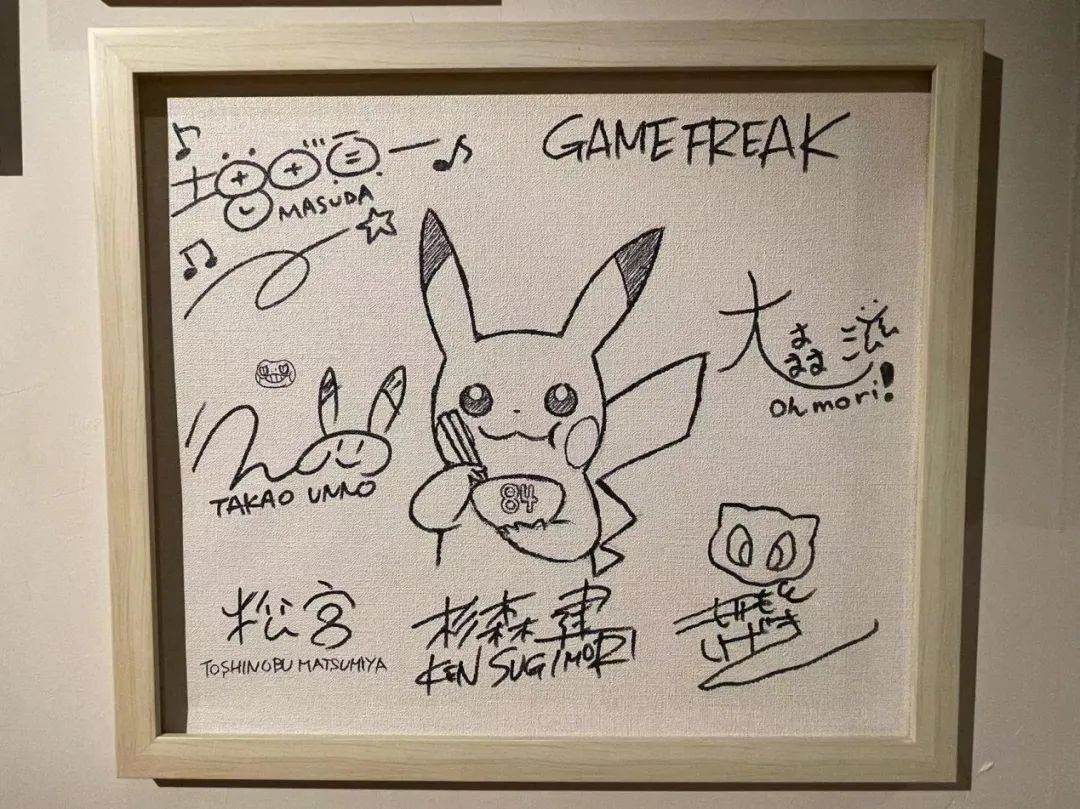 在進門的右手方,也是一面有很多珍貴簽名的牆面,主要是和精靈寶可夢有關,比如寶可夢公司現任社長石原恆和的簽名,帶有店名元素的皮卡丘乾飯圖上則有增田順一等Game Freak幾名主創的簽名;皮卡丘和小智的海報上是寶可夢英文版中小智的配音Sarah Natochenny的簽名。