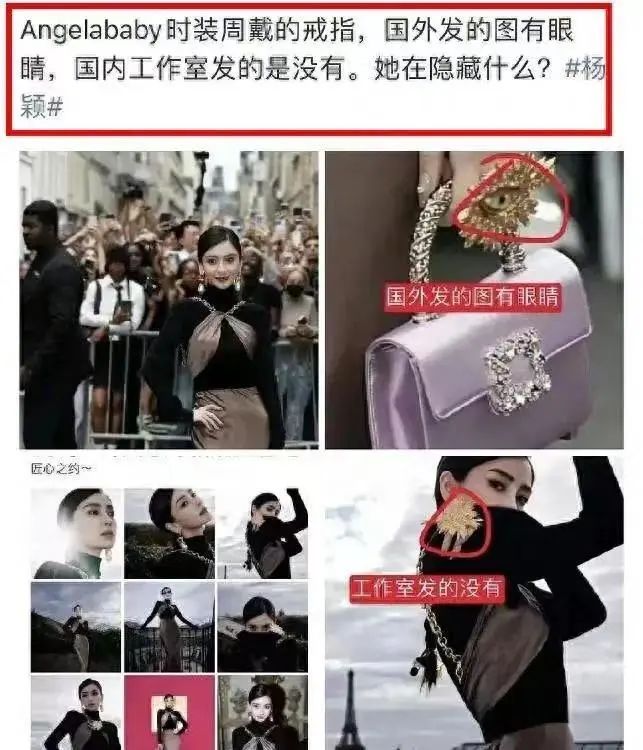 還有網友發現Angelababy時裝週戴的戒指,她在國外發的圖片有眼睛,國內工作室發的卻沒有。