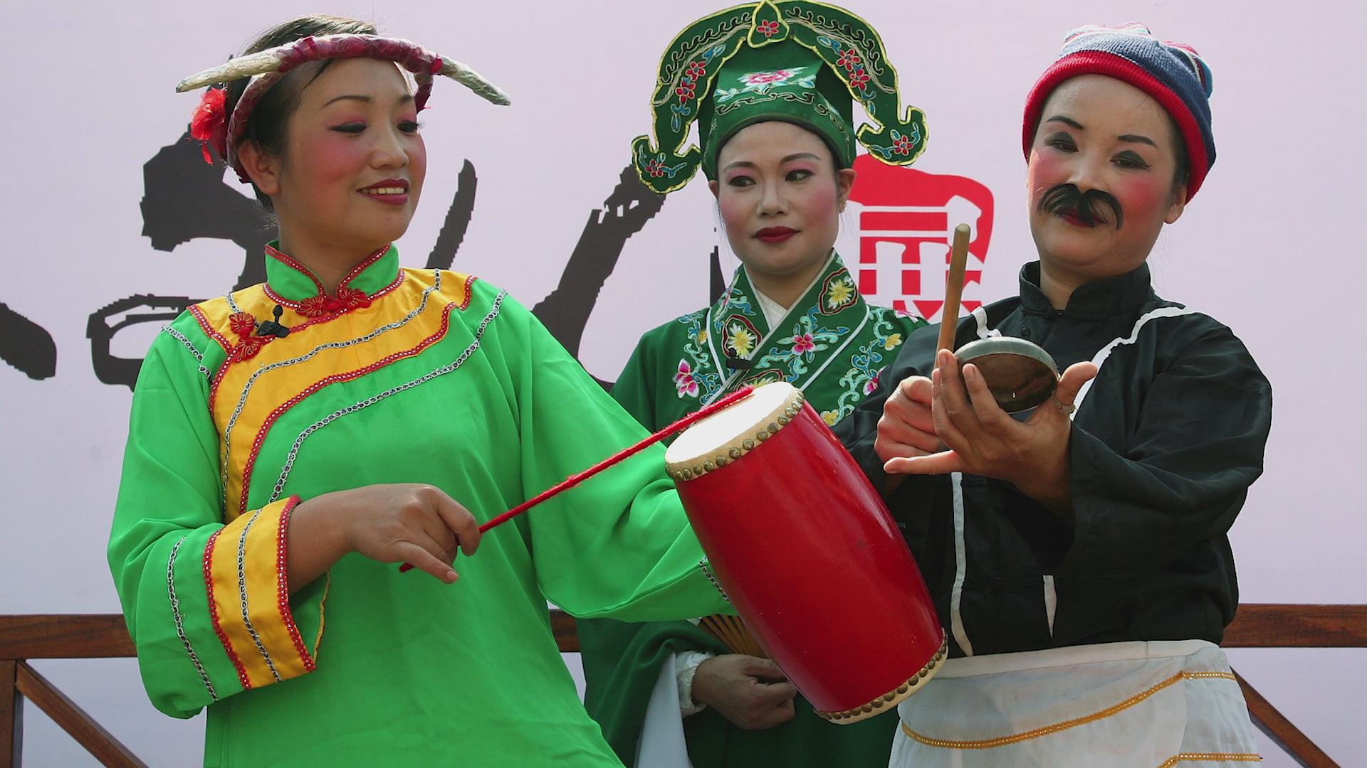 包山花鼓戲(左為旦角鳳陽婆,中為生角大相公,右為丑角花鼓公)