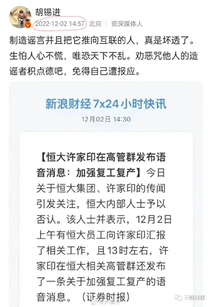 一年前,許家印事件流言四起,胡錫進發文怒斥關於許家印的謠言。
