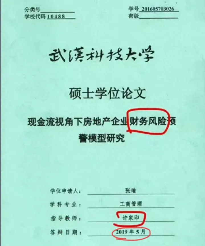 一篇名為《現金流視角下房地產企業財務風險預警模型研究》的碩士畢業論文出現在網絡上,細看其指導老師,竟然是許家印。