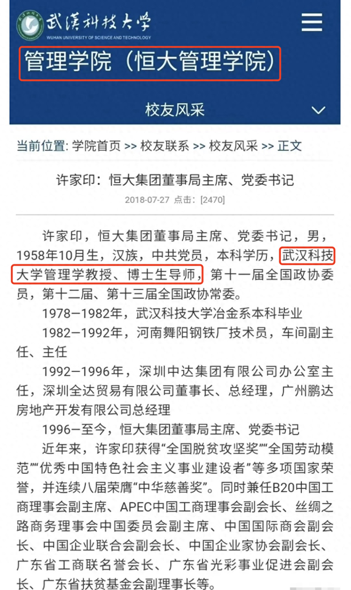 原來許家印曾任其母校武漢科技大學管理學院的教授、博士生導師,這是他2019年帶的一位研究生,而且武漢科技大學的管理學院也叫“恒大管理學院”。