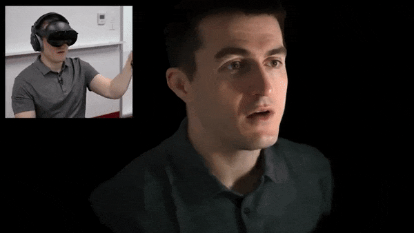 想象未來進入會議室,有些人實際在現場,有些人則以這種逼真的虛擬形態出現,並通過結合混合現實技術疊加在物理環境上:你以為TA坐在桌子邊跟你聊項目,其實TA遠在千里之外;夜深人靜一個人在外地想家的時候,帶上頭顯親人就近在咫尺。而對面人的一顰一笑,每一個細微的面部表情,都可以幾乎沒有延時和耗損地立體真實再現。