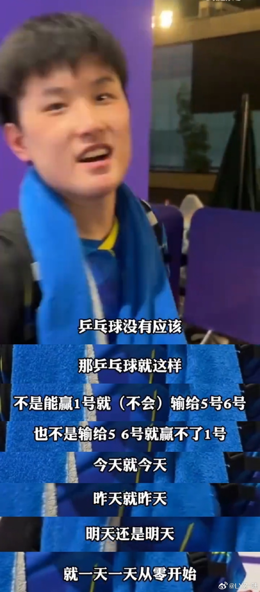 張本智和沒想就説,乒乓球沒有應該。不是你能贏1號就不能輸五號六號,也不是輸給五號六號就贏不了一號。昨天就昨天,明天還是明天,一天天從零開始。