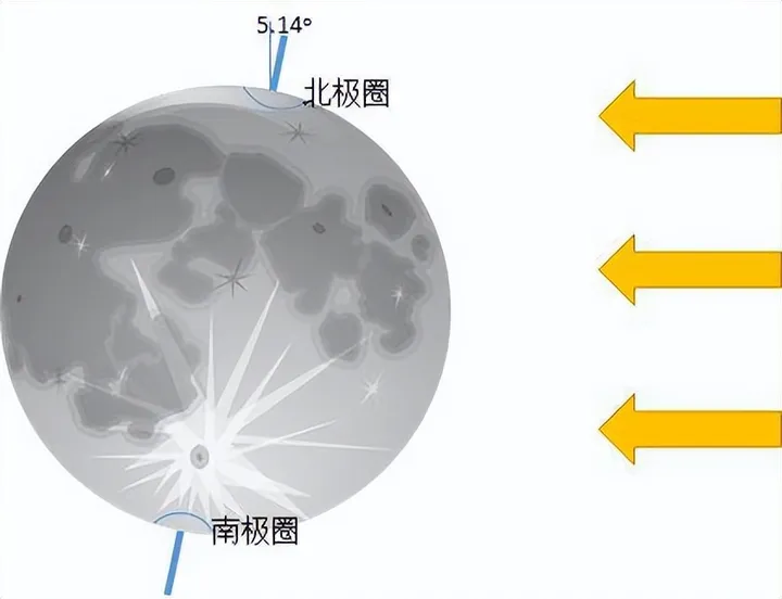 他解釋道:“月球的自轉軸與黃道面法線的夾角只有1.5度,幾乎垂直黃道面。我們通常參照地球的情況,把月球上緯度88.5度到90度的區域稱為月球的‘南極’極區與‘北極’極區。”