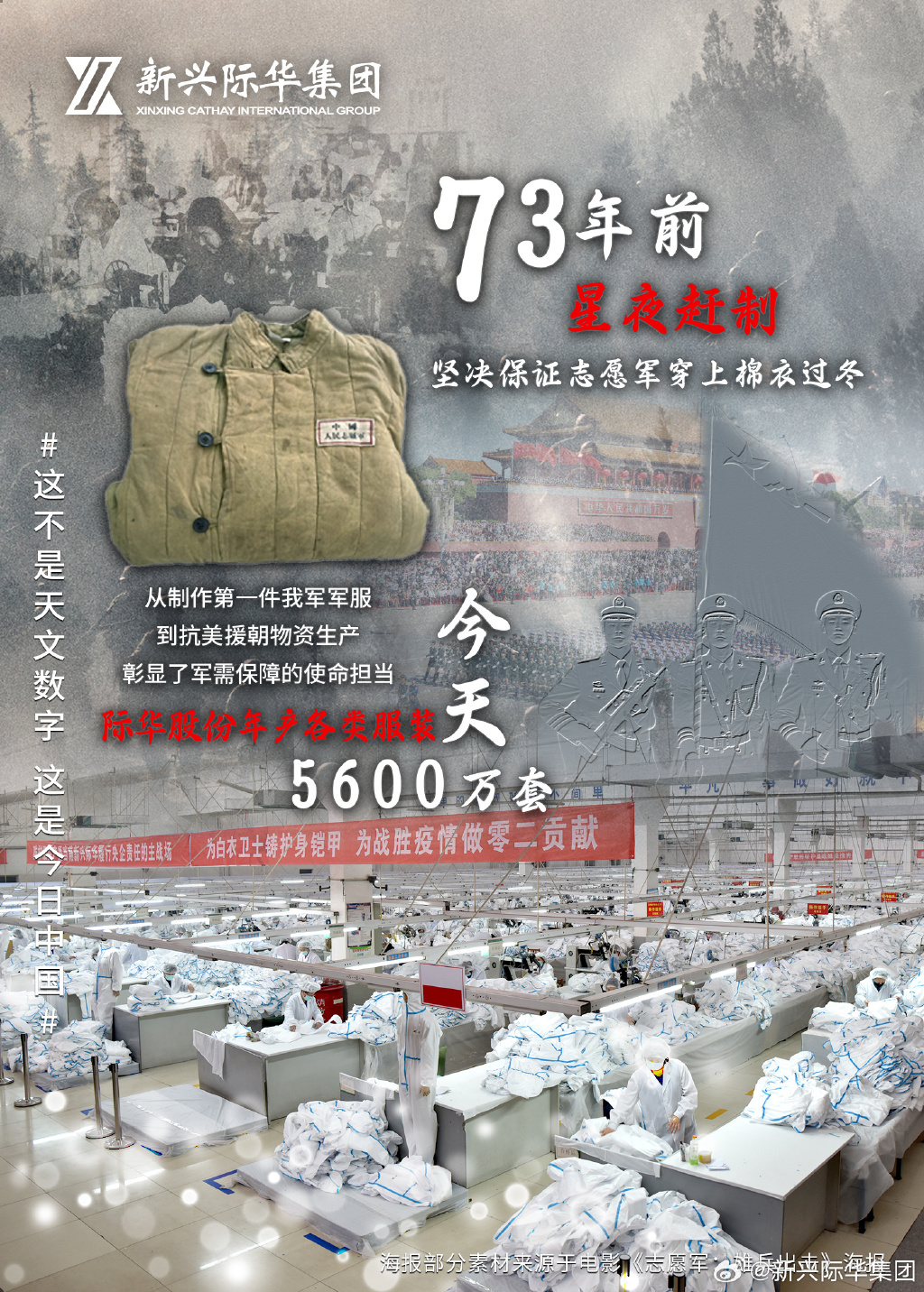 @新興際華集團:1950年的朝鮮遭遇了幾十年一遇的極寒天氣。作為當時全軍後勤軍需生產保障單位,新興際華軍需保障企業加緊生產,支援前方,軍需職工同仇敵愾,通宵達旦,夜以繼日地奮戰在支援前線的被裝生產中,只為那句“堅決保證志願軍穿上棉衣過冬”的錚錚誓言。如今,新興際華集團所屬際華股份公司已具備年產各類服裝5600萬套、服飾產品2800萬件、鞋靴7500萬雙、坯布5700萬米、印染色布7400萬米的生產能力,已成為國內重要的軍需、武警、工裝、行配等制式服裝、鞋靴的生產基地和整合型系統服務商,在打造功能性防護性面料引領者和職業裝引領者上展現“保軍、應急、為民”的使命擔當。