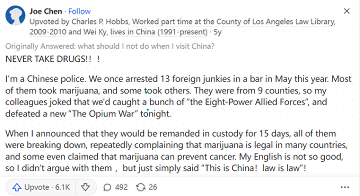 在美版知乎,有外國人提問:“去中國我不應該做什麼?”出乎小編意料的是,大多數回答都是在提醒外國人不要妄想在中國碰毒品。