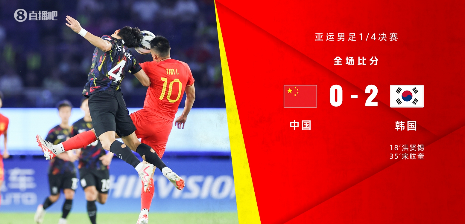 直播吧訊 亞運會男足1/4決賽,中國vs韓國,上半場,洪賢錫任意球直接破門,韓佳奇奉獻神撲後失誤致丟球,朱辰傑傷退,尾聲階段戴偉浚頭球中柱。易邊再戰,雙方互有攻防但均破門乏術。最終中國0-2韓國止步八強,遺憾結束本次亞運會的征程。