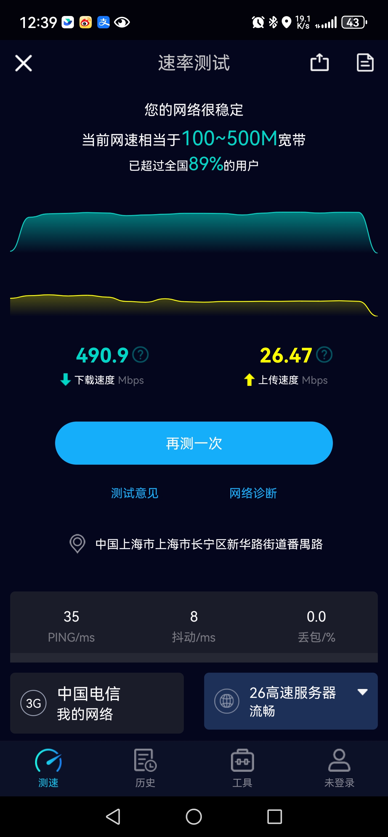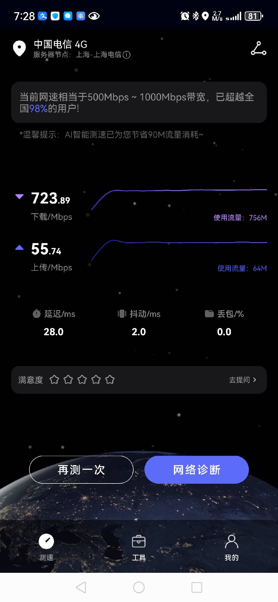 用官方測速軟件——花瓣測速跑一下4G的速度,下行流量723.89,上傳速度55.74。