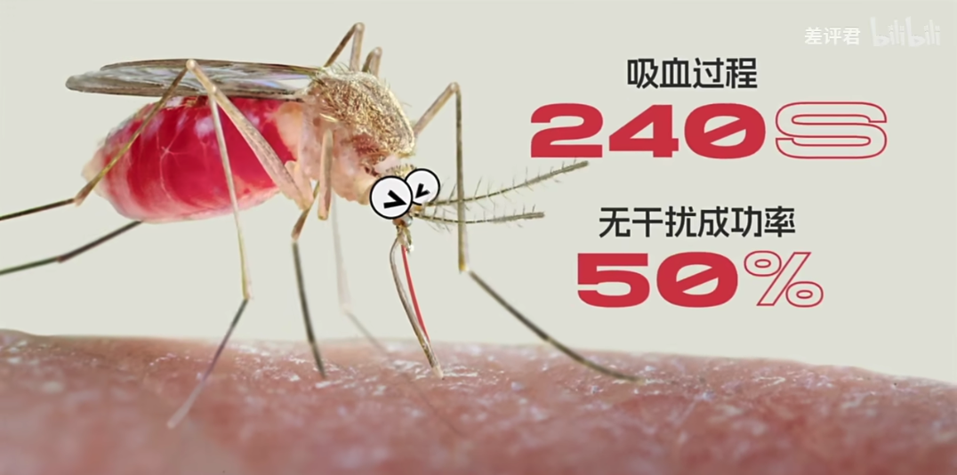 整個吸血過程差不多要 240 秒,即使是無干擾的條件,蚊子都有一半幾率吸不到血。