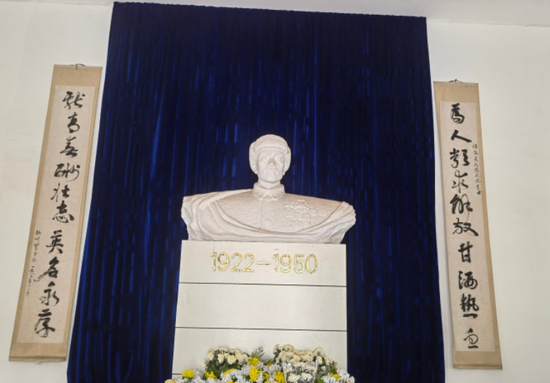 根思鄉有一座壯觀的烈士陵園,只為紀念一個無產階級的孩子,一個父母雙亡從小給地主資本家打工的孩子,一個剛上戰場就能用長矛殺敵的少年英雄,一個解放戰爭中所向披靡的“爆破大王”和“一級戰鬥英雄”,一個朝鮮戰場上唯二的“特級英雄”、“偉大的國際主義戰士”。一個光榮的連隊,以他的名字命名,一箇中國的鄉鎮,同樣以他的名字命名。他的雕像高大偉岸,把他犧牲前的一幕,定格在歷史的長河中,他懷抱炸藥包,目光堅毅,腳下踩的是“US”。