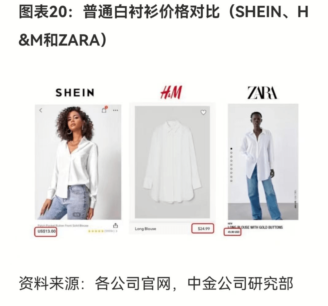 據中金報告數據,以一件普通的白襯衣為例,SHEIN售價13美元,H&M售價24.99美元,ZARA售價45.9美元。相比之下,SHEIN幾乎比H&M便宜一半,與ZARA相比,更不到其價格的三分之一。