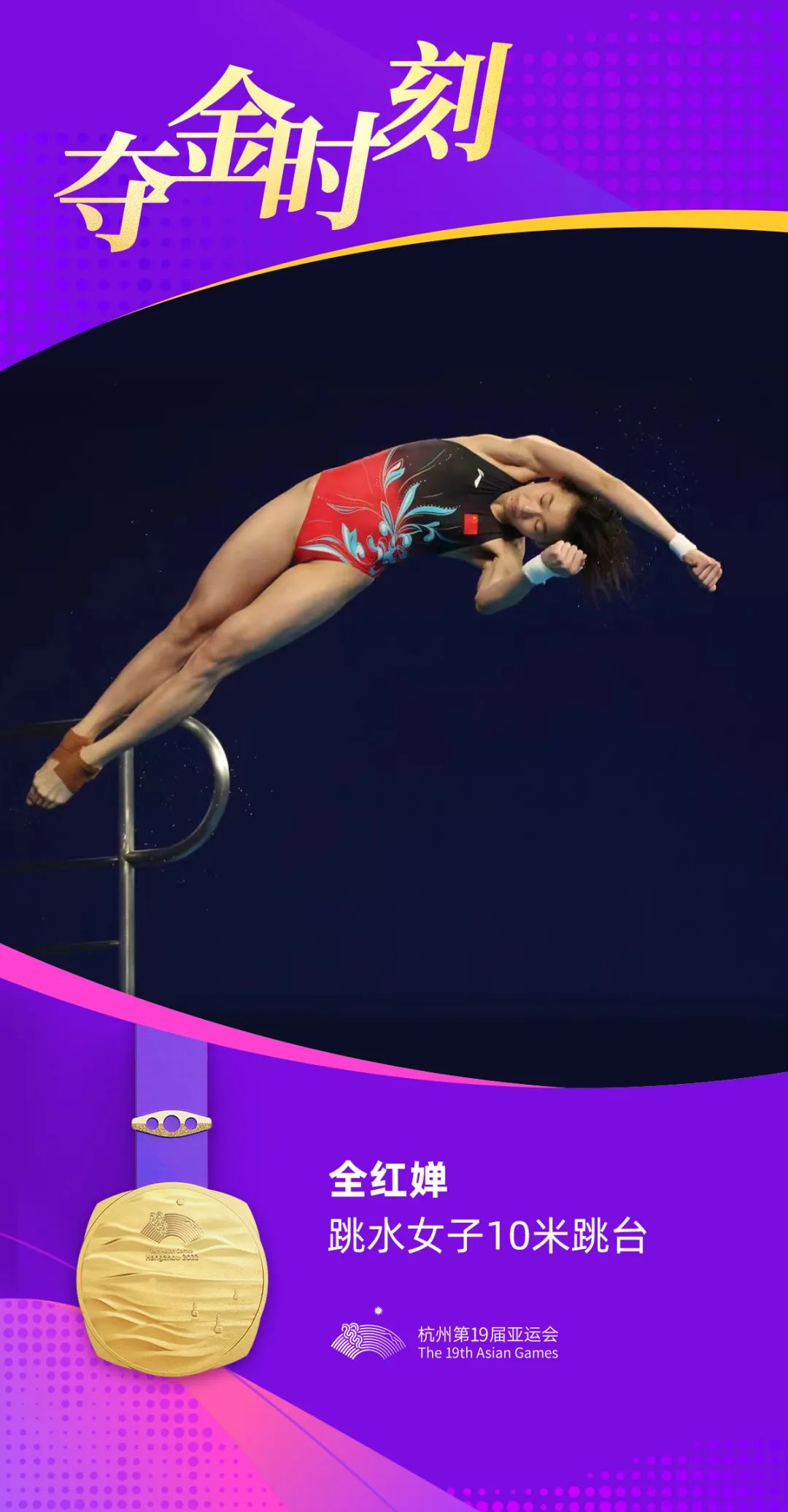 在最後一跳,全紅嬋獲得94分,以2.55分的微弱優勢反超陳芋汐奪冠,收穫個人亞運第二金,幫助中國國家跳水隊實現該項目13連冠。