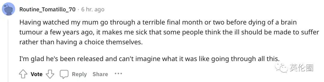 “我母親去世前的幾個月充滿了痛苦,我厭惡那些不讓絕症患者選擇自己未來的人。我很高興他被釋放了。”
