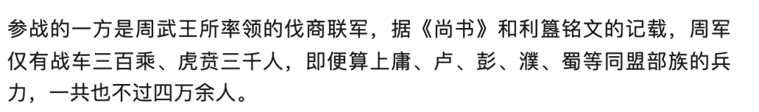 一篇文章,錯漏百出。文章裏面説根據《尚書》和利簋銘文的記載,周軍戰車三百乘、虎賁三千人,加上同盟部族的兵力,一共四萬餘人。