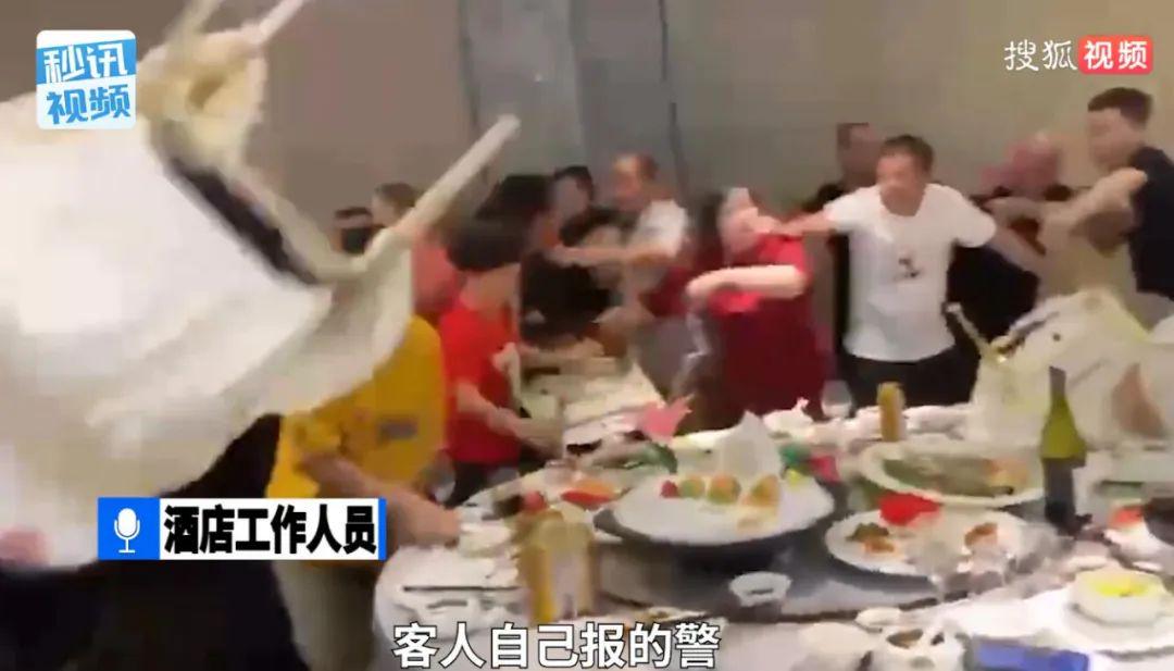 網絡流傳的視頻中,數十人圍聚在一起,有抄起桌上的餐具一盤一碗奮力向外扔的,有舉起椅子脱手往遠處砸的,有用盡全力大打出手的……
