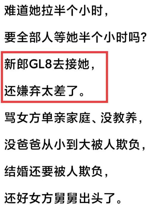 據網友透露,男方舅媽的不悦產生在更早之前,因為婚禮本着優先女方孃家人的原則,孃家人前往酒店時乘坐了高檔汽車,而舅媽卻沒坐上,這讓她感覺到自己不被重視。