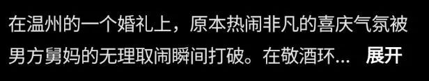 據傳,婚禮現場新人敬酒的環節,新郎新娘走到舅媽桌前敬酒,卻發現舅媽去了廁所並未在席間。出於時間上的考慮,新郎新娘轉到了其他桌先行敬酒,等到舅媽回來後發現新人先給別人敬了酒,內心就已經有了一絲不悦。見到舅媽從廁所返回席間,一對新人也趕了過來,準備再次向舅媽敬酒,沒想到這時舅媽挑起刺來,她嫌棄新娘敬酒聲音太小,指責新娘缺乏家教。