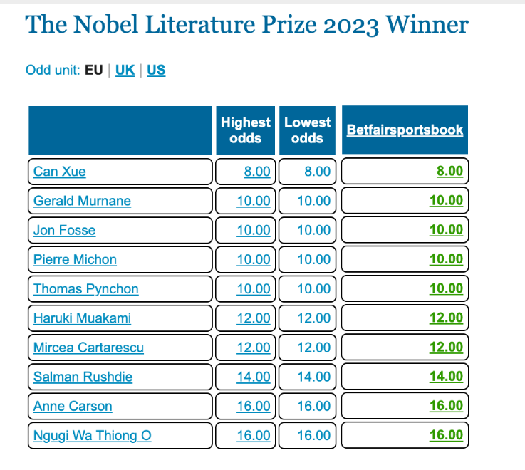 ● 英國博彩公司NicerOdds 2023年諾貝爾文學獎賠率榜