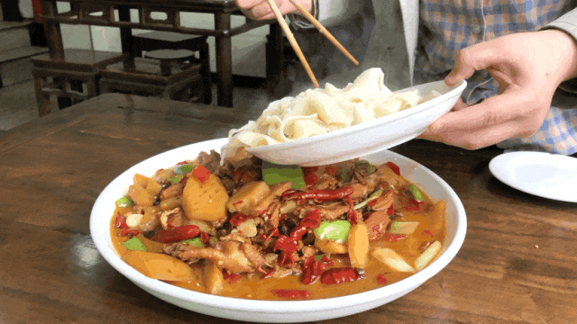 講到大盤雞,就不得不提一下大西北,大盤雞的分量大,這像極了西北人的豪爽的性格和能吞牛羊的大飯量,三五好友吃上一盤大盤雞,再來幾份皮帶面,紮實的一頓飯,吃的舒心又舒服。
