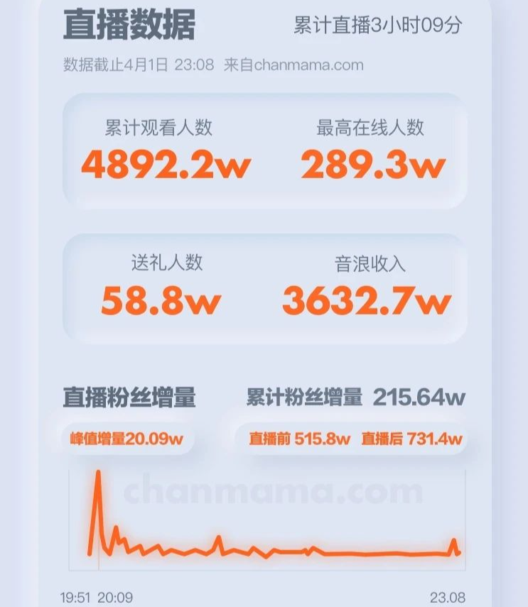 2020年4月1日,羅永浩進行了一場持續3個小時的直播帶貨首秀,實現了超1.1億元的成交總額,累計觀看人數超4800萬人,創下了抖音平台當時已知的最高帶貨紀錄。有消息稱,這場直播抖音方面給到3億曝光量的支持。抖音同時段其他直播間也內放置了羅永浩直播間的入口。當時的抖音電商剛剛起步,羅永浩在話題度、GMV數據等層面都領先於其他主播,他的橫空出世,也是抖音電商的破局。